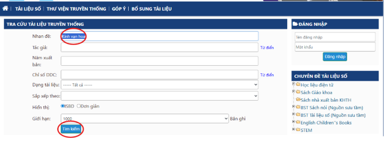 Click vào ô TRA CỨU TÀI LIỆU --> chọn mục Tra cứu Tài liệu truyền thống